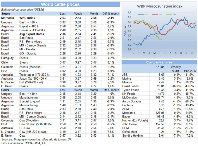 本周南方共同市場閹牛指數(shù)保持在2.63美金/公斤,本周阿根廷比索再度貶值4.1%,雖然本地閹牛價格上漲,但換算成美金還低了10美分,2.56美金/公斤,而巴西亞雷爾增值1.5%,雖然閹牛價格低了1亞雷爾/公斤,換算成美金還高了2美分,2.36美金/公斤。烏拉圭和巴拉圭牛價幾乎不變。