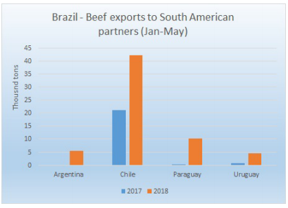 由于亞雷爾兌美元貶值嚴(yán)重,巴西牛價大幅下滑,使得2018年對南美其他國家出口量增長兩倍,一到五月總共對智利,阿根廷,巴拉圭和烏拉圭出口62400噸牛肉,其中冷凍牛肉增幅比冷鮮要高,但是平均牛價與去年同期相比從4343美金降低到3711美金。南美主要牛肉進口國智利從巴西進口了42300噸牛肉,比去年同期增長一倍,主要是巴西牛價低以及巴拉圭某些工廠關(guān)閉導(dǎo)致。預(yù)期今年巴西對南美地區(qū)出口會一直保持在高水平。