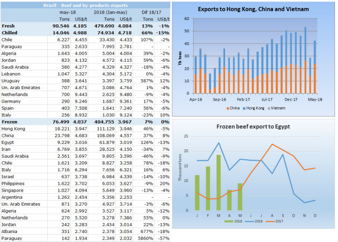 巴西對中國牛肉直接出口量超過了去香港的量,達到了23798噸,香港為18221噸,主要是近期從香港到中國運輸很困難,不過一到五月出口香港的牛肉還是最多,達到了111129噸,然后是出口中國108069噸。中國香港和越南五月一共買了42162噸,比四月份28619噸增加了47%,比去年五月增加25%。第三大出口國是埃及,五月共買了9229噸,雖然比四月多了7000噸,還是遠(yuǎn)低于第一季度平均水平。