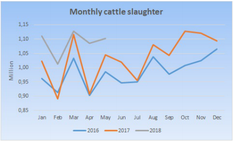 澳洲天氣干旱活牛供應(yīng)增加,導(dǎo)致五月出口量大增,五月總出口109700噸,歷史上只有2015年五月由于干旱原因出口量更高。五月出口量比四月高了21500噸,即24%,比去年五月高15%。五月總共屠宰58萬頭,比去年同期增長10%,一至五月總屠宰269萬頭,比17年增加8%。出口到亞洲的牛肉總量創(chuàng)下了月度紀(jì)錄,比之前最高峰高了10%,亞洲國家比如印尼,南韓,日本和中國需求都增長不少,一至五月出口日本125700噸,同比增長12%,出口美國91700噸,同比增長4%,出口韓國61700噸,同比增長15%,出口中國59400噸,同比增長40%。