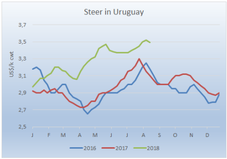 今年進口牛肉的演變很令人吃驚,不管在肉店還是超市,都很容易買到巴西進口的三角肉或其他部位牛肉,比烏拉圭價格低。截止到2018年8月,海關數(shù)據顯示一共進口了8767噸牛肉,其中84%冷鮮牛肉主要直接去到零售市場,16%冷凍牛肉主要去工業(yè)生產。進口量一直在增長,7月達到1620噸,月度最高記錄,8月前8天達到450噸,如果保持這個節(jié)奏,8月進口量會超過1700噸。進口量的增長主要是烏拉圭活牛價格比周邊國家高導致的,烏拉圭特種閹牛本周價格達到3.5美金/噸,而巴西價格才2.4美金,差價達到40%使巴西牛肉非常有競爭力。而烏拉圭生產成本過高也使巴拉圭牛肉更有競爭力,雖然巴拉圭牛價和烏拉圭差不太多(3.15美金)。此外烏拉圭缺牛會進一步提高牛價。