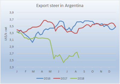 美國和土耳其的政治危機嚴重影響到了新興國家的貨幣,南方共同市場各國也受到了影響,本地閹牛均價被拉低。本周南方共同市場閹牛指數(shù)降低了6美分到2.66美金/公斤,近四周最低。前期由于本地牛價上漲以及貨幣貶值趨緩,美金牛價逐漸恢復,此趨勢被打破,阿根廷比索對美元貶值8.2%,巴西雷亞爾貶值3.6%。巴西本地育肥牛價漲到137.1雷亞爾,漲幅0.8雷亞爾,但換算成美元降低了7美分到2.34美金,阿根廷情況也一樣,出口閹牛價格漲了1比索,但由于貨幣貶值,美金價減少了17美分至2.57美金。烏拉圭牛價也顯示出降低趨勢,因為猶太團隊即將撤離,開始為481配額準備牛肉生產。本地區(qū)只有巴拉圭一個國家牛價上漲,漲了5美分。