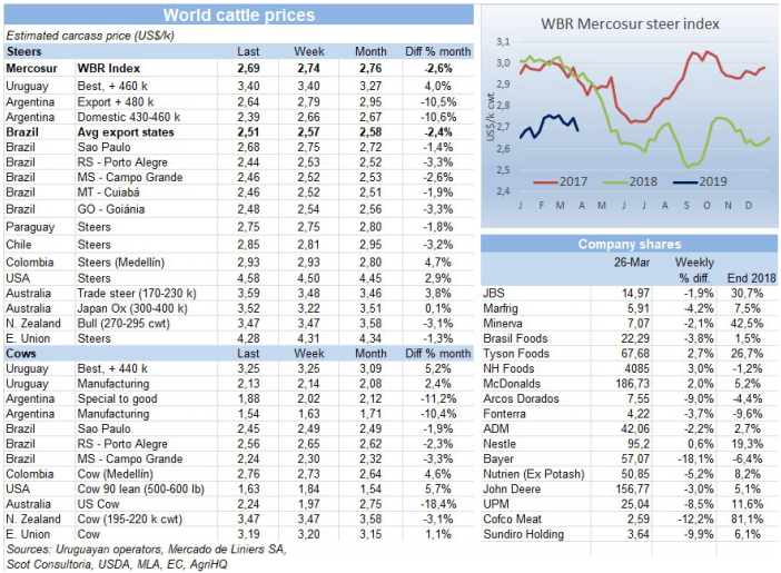 本周南方共同市場各國貨幣大幅貶值,對美金閹牛價格產(chǎn)生了不少影響,南方共同市場閹牛指數(shù)跌了5美分到2.69美金,一月底以來最低。巴西雷亞爾對美金貶值2.5%,阿根廷由于國內(nèi)經(jīng)濟困難比索貶值5%,因此巴西閹牛價格跌了6美分到2.51美金,而阿根廷牛價跌了15美分到2.64美金。烏拉圭特種閹牛價格達(dá)到了平衡,3.4美金,而巴拉圭牛價還是比較疲軟,保持在2.75美金。