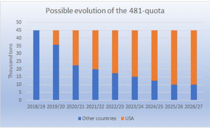 美國與歐盟已經(jīng)就481配額達(dá)成協(xié)議,歐盟初步給美國1.85萬噸的獨家配額,六年半之后逐步增加到3.5萬噸。481配額總共4.5萬噸,分四個季度,每季度1.125萬噸,由美國、烏拉圭、阿根廷、澳洲、新西蘭和加拿大分配。協(xié)議生效后,原有國家配額將在2020年上半年先減少9250噸,然后每年減少2500噸,直至2025/26年減少到只剩1萬噸。近幾年烏拉圭和澳洲每年各用掉1.6萬噸481配額,他們的配額將會大幅減少,阿根廷481配額增長也很迅速,去年達(dá)到6800噸,也會受到配額減少的影響。