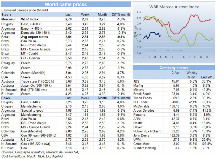 第一季度烏拉圭對(duì)歐盟出口了9535噸冷鮮牛肉,同比增長1%,因?yàn)橄栴D配額價(jià)格下跌,平均離岸價(jià)跌了4%到9367美金,而冷凍牛肉市場(chǎng)反應(yīng)冷淡,三月出口817噸,第一季度2877噸,同比減少42%,離岸均價(jià)6532美金,同比下跌11%。烏拉圭18/19農(nóng)業(yè)年希爾頓和481配額出口量都有所下降,截止到3月22日,希爾頓配額出口量4905噸,同比減少5.5%,481配額出口9961噸,同比減少13.5%,希爾頓配額離岸均價(jià)跌了9.8%到10628美元,而481配額均價(jià)跌了2.9%到9417美元。
