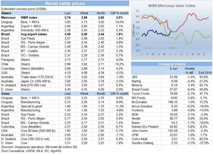 南方共同市場閹牛價格上漲6美分到2.74美金/公斤,三月中以來最高,主要驅動力來自巴西雷亞爾,雖然對經濟增長減速有所擔憂,本周還是增值3.5%,主要出口州牛價只上漲了0.3雷亞爾/15公斤,到141雷亞爾,但換算成美金牛價上漲了9美分到2.49美金。烏拉圭活牛市場還是過熱,閹牛價格本周再度上漲12美分,比其他國家都高了1美元/公斤以上。阿根廷和巴拉圭牛價沒有變化。