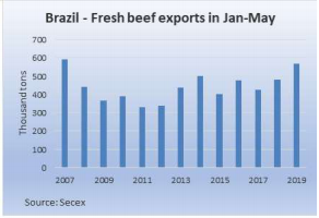 巴西牛肉出口量還在穩(wěn)步增加,由于全球對動物蛋白需求增長,五月牛肉、豬肉以及禽肉出口量都有增加,五月牛肉出口量達到12.1萬噸,同比增加34%,均價3883美金,同比降低7.1%。前五個月巴西共出口56.7萬噸,均價3780美金,出口量同比增加18.2%,均價下跌7.4%。五月豬肉出口量5.81萬噸,2017年八月以來最高。