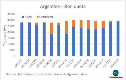 截止到上周,也就是離2018/19財(cái)政年不到20天的時間,阿根廷已經(jīng)發(fā)運(yùn)了29440噸希爾頓配額牛肉,幾乎馬上能完成29500噸的配額,這是自2008/09年以來阿根廷第一次能完成希爾頓配額,去年完成了配額的95%(28091噸)。2018/19年58%的牛肉去了德國,20%去荷蘭,5%去意大利。同時截止到五月阿根廷發(fā)運(yùn)了7573噸481配額牛肉。