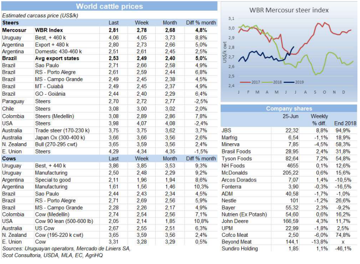 南方共同市場(chǎng)閹牛價(jià)格本周又增長(zhǎng)了3美分到2.81美金/公斤,自五月上旬以來(lái)已經(jīng)上漲了15美分,主要是受美元疲軟因素驅(qū)動(dòng),阿根廷比索增值2.6%,四月中以來(lái)最高,巴西雷亞爾增值0.8%,三月中以來(lái)最高。巴西主要出口州育肥牛價(jià)格上漲1雷亞爾到141.5雷亞爾/15公斤,美金牛價(jià)漲了4美分到2.53美金/公斤,阿根廷牛價(jià)略微下調(diào),但比索增值導(dǎo)致美金牛價(jià)漲了7美分到2.8美金,烏拉圭牛價(jià)上行似乎失去了動(dòng)力,本周只漲了1美分,而巴拉圭牛價(jià)處于熊市,本周2.7美金/公斤。