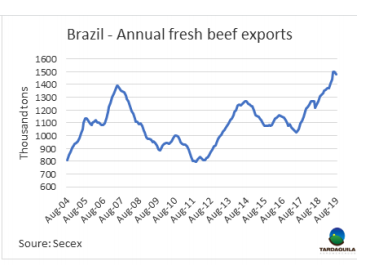 巴西鮮牛肉出口量仍處于較高水平,但不足以與過去幾年出口量持平,出口上漲趨勢可能達(dá)到了150萬噸年度最高,此后可能輕微下行。八月巴西出口鮮牛肉126506噸,低于七月出口量12.9萬噸和去年8月出口量14.4萬噸。平均出口價(jià)格4178美元/噸,比七月出口價(jià)格增長5%,創(chuàng)13個(gè)月以來新高。巴西八個(gè)月合計(jì)出口93.4萬噸鮮牛肉,平均出口價(jià)3872美元/噸,出口量年度增長15%,平均價(jià)格減少9.5%。
