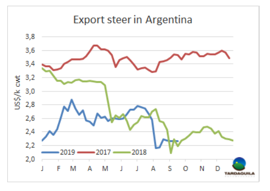 今年,巴西冷鮮牛肉出口歐盟平均價格猛烈下跌。本年度截至八月均價7298美元/噸,比2018年同期減少17%,八月降價趨勢仍然持續(xù),均價6640美元/噸。冷凍牛肉情況一樣,年平均價格下跌12%,降至5451美元/噸。