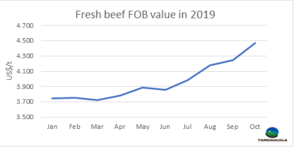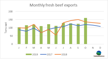 中國市場的更好機(jī)會(huì)使冷凍牛肉到歐洲市場出口量減少至本世紀(jì)初口蹄疫危機(jī)后最低水平。根據(jù)海關(guān)出口數(shù)據(jù),10月冷凍牛肉到歐洲出口量僅323噸,今年截至10月,出口量總計(jì)7796噸,比2018年同期減少44%。另一方面,冷鮮牛肉出口至歐洲共1044噸,因?yàn)樯蟼€(gè)月481配額范圍內(nèi)的發(fā)貨量幾乎為零。今年截至目前冷凍牛肉和冷鮮牛肉出口至歐洲量減少21%,減少至2.8萬噸。