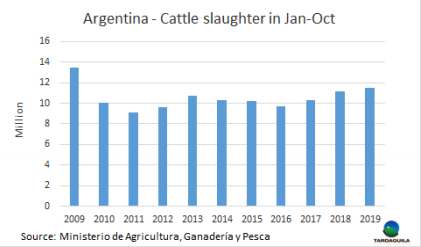 10月阿根廷牛只屠宰量超過130萬,創(chuàng)2009年以來屠宰量最高紀(jì)錄,2009年在基什內(nèi)爾政府實(shí)施了三年的反出口政策之后,這一年發(fā)生了嚴(yán)重的母牛存欄缺失,嚴(yán)重的干旱更加劇了這種效應(yīng),導(dǎo)致約20%的存欄流失。與當(dāng)時(shí)不同的是,今年養(yǎng)牛者不會(huì)因此而決定退出不錯(cuò),而是決定利用中國牛肉價(jià)格極好的有利條件,在總體形勢不太好同時(shí)又缺乏以可承受的信貸利率的情況下。雖然現(xiàn)在沒有看到母牛的存欄的缺失,但一些人對此表示擔(dān)憂,并對此進(jìn)程持謹(jǐn)慎態(tài)度。當(dāng)中國新年的推動(dòng)力逐漸消失時(shí)會(huì)發(fā)生什么我們將拭目以待。