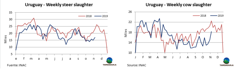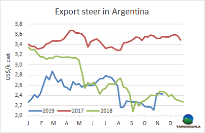 大選結(jié)果確定和貨幣兌換管控過后出口價(jià)格仍然堅(jiān)挺。英國純種閹牛報(bào)價(jià)140-145比索/公斤,印度串種閹牛報(bào)價(jià)136-140比索/公斤,母牛價(jià)格上漲趨勢受中國需求影響,仍保持上漲趨勢:特種和良種母牛報(bào)價(jià)140-145比索/公斤,工業(yè)母牛報(bào)價(jià)125-130比索/公斤。