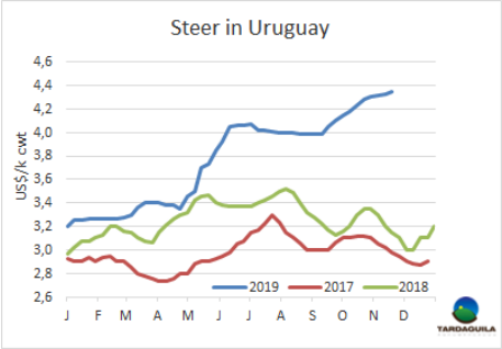 受巴西價格強勢增長影響,南方共同市場閹牛平均價格強勢增長,南方市場閹牛價格指數本周上漲20美分,上漲至至3.1美元/公斤,達到自2016年10月三年多以來最高水平。巴西直接出口中國的工廠增加,需求端對相對短缺的供應端做出反應,本周價格按雷亞爾計算增長了13%,按美元計算增長了12.4%,主要的出口州老公牛平均胴體價格3.03美元/公斤,一周內增長了34美分。阿根廷情況則不同,出口閹牛價格仍然保持10月末的水平,歐洲需求的減少對價格有一定影響。巴拉圭市場更加穩(wěn)定,胴體價格2.8美元/公斤,達到3月初至今最高。烏拉圭特種閹牛價格達歷史最高,胴體價格4.35美元/公斤,在接下來的幾天價格會趨于平緩。