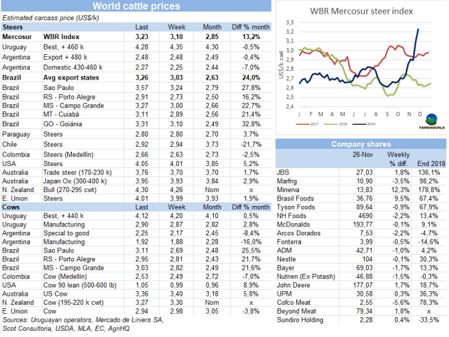 巴西育成牛價(jià)格上漲趨勢(shì)沒(méi)有停止,再次影響南方共同市場(chǎng)閹牛價(jià)格,本周南方市場(chǎng)閹牛價(jià)格上漲13美分,上漲至3.23美元/公斤,達(dá)到2015年5月至今四年半以來(lái)最高。盡管本周巴西雷亞爾匯率下跌1.6%,主要出口周胴體平均價(jià)格上漲13美分,上漲至3.26美元/公斤。阿根廷和巴拉圭本周價(jià)格并沒(méi)有太大波動(dòng),烏拉圭價(jià)格下跌7美分。