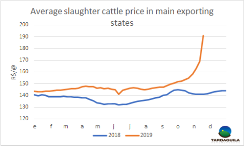 供應(yīng)短缺不僅在活牛價(jià)格上體現(xiàn)出來(lái),也體現(xiàn)在出口量上。11月前4周15個(gè)工作日內(nèi)巴西出口牛肉90514噸,照此推測(cè)到月底將達(dá)到12萬(wàn)噸,遠(yuǎn)低于10月出口量(16萬(wàn)噸),也低于2018年11月出口量(13萬(wàn)噸)。本月截至今日平均出口價(jià)格4868美元/公斤,月增長(zhǎng)9%,年度同比增長(zhǎng)22%。