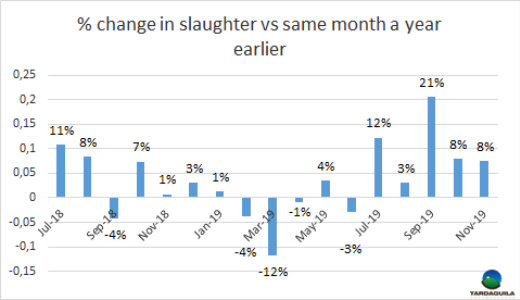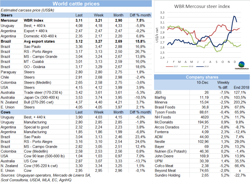 上周牛只屠宰量提高,一部分由于是歐洲481配額牛只生產(chǎn),還因為缺水的氣候狀況導(dǎo)致草飼牛供應(yīng)增長。烏拉圭肉協(xié)報道,截至12月7日的一周合規(guī)屠宰場屠宰牛只47124頭,比上一周增長1.2%,(增長540頭),創(chuàng)5月最后一周至今6個月以來新高。由于屠宰活動集中于1月1后下一季度481配額牛只生產(chǎn),閹牛和小母牛占大多數(shù),閹牛屠宰量24034頭,比上周增長2549頭,達(dá)5月25日以來周屠宰量最大。小母牛屠宰量比上周減少,但仍然很高(7767頭),母牛屠宰量減少1229頭,減少至14268頭。全球屠宰量與去年同期幾乎相同,但構(gòu)成卻大不相同:閹牛和小母牛屠宰量增長5000頭以上,母牛屠宰量減少5.4萬頭以上。屠宰量最大的三個工廠是Las Piedras(4020頭),NH-BPU(3986頭),Marfrig-Tacuarembo(3523頭)。Marfrig4家廠總屠宰量13155頭,屠宰量是2月中旬以來最大。Minerva2家廠屠宰量6762頭。