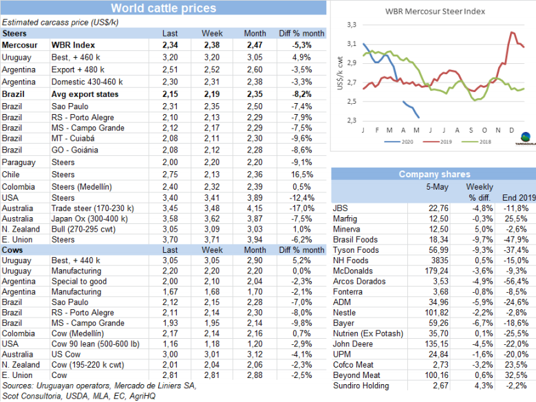 自疫情開始襲擊南美地區(qū)以來,南方共同市場閹牛平均價格保持下行趨勢。本周閹牛價格2.34美元/公斤,較上周下跌4美分,較2月末下跌64美分,下跌了21.5%。本周巴西貨幣貶值仍然是主導(dǎo)因素,疫情對巴西政治和公共衛(wèi)生方面的影響導(dǎo)致其貨幣再次貶值1.5%,較2月末貶值27.4%。巴拉圭活牛價格下跌也拉低了該地區(qū)閹牛價格指數(shù),巴拉圭待宰活牛價格本周下跌20美分,下跌至2美元/公斤。阿根廷和烏拉圭本周參考價格保持穩(wěn)定。