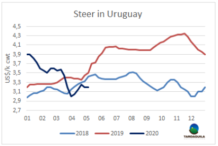 由于歐洲市場需求受新冠肺炎疫情影響,4月烏拉圭至歐盟國家牛肉出口量達(dá)歷史最低,冰鮮牛肉出口量下降更加明顯。根據(jù)海關(guān)發(fā)布數(shù)據(jù),4月烏拉圭出口至歐盟國家冰鮮牛肉265噸,冷凍牛肉415噸,冰鮮牛肉出口量只有481配額季度開始月份(即該季度銷量最低的月份)銷量的三分之一。今年前四個月烏拉圭至歐盟國家出口冰鮮牛肉共6046噸,平均出口價格9815美元/噸,年度對比中出口量減少了23%,平均出口價個上漲了4%,近幾周價格的大幅下跌將把平均價格的差異增長拉低至負(fù)數(shù)。
