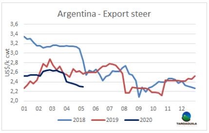 雖然在隔離令開始時,阿根廷國內(nèi)市場的牛肉消費(fèi)出現(xiàn)反彈,但隨著實行社會補(bǔ)貼,最初的熱情逐漸消退。一位市場專家指出,這些天來,恐慌累積導(dǎo)致許多產(chǎn)品的需求下降,原因是家庭預(yù)算問題,信用卡的使用時間縮短到月底。牛肉是受到影響的一種商品,價格與國外市場相比很低,本地也沒有其他的食物的競爭,這反映出供應(yīng)多而價格下跌。此外閹牛的需求端出現(xiàn)問題,國內(nèi)需求僅能消費(fèi)牛肉產(chǎn)量的四分之三。