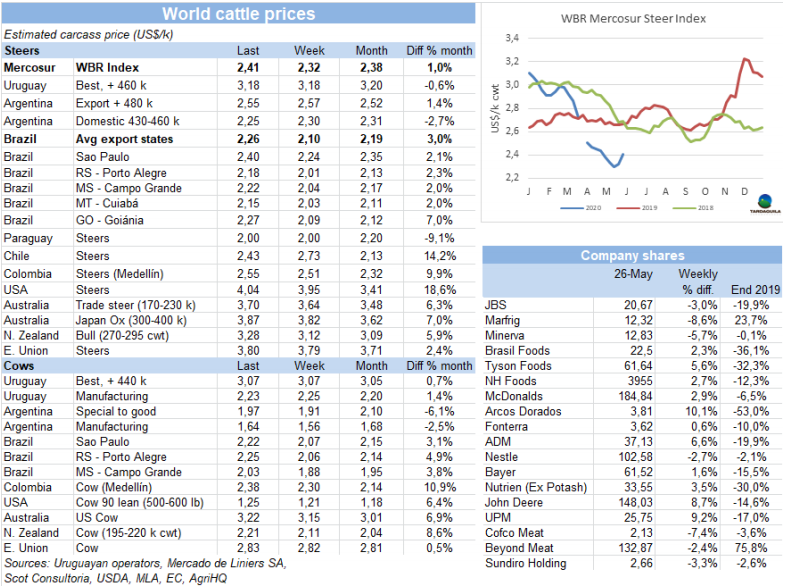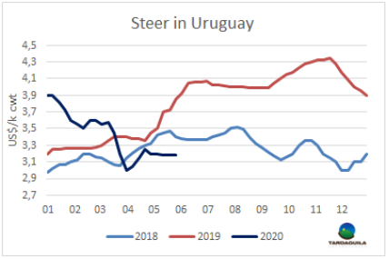 在公布四月的閹牛類型價值數(shù)據(jù)時,烏拉圭肉協(xié)做了一些澄清,強調(diào)“在當(dāng)前條件下,平均工廠增值價值無法覆蓋工廠成本”。4月閹牛類型價值每頭較3月下跌了85美元,下跌至1162美元,達(dá)2019年5月以來最低。2019年5月中國進口價格開始飆升。牛只的平均采購價格急劇下降,每頭降了120美元,降至835美元。因此,每頭牛的增值價值(兩者之間的差額,即工廠必須支付的其他成本,并最終獲得的收益)增加了35美元,至327美元,這是自2017年12月以來的最高水平。烏拉圭肉協(xié)提醒,閹牛類型價值只反應(yīng)“計算時可用的統(tǒng)計數(shù)據(jù),不包括一些出口合同中額外的變化。”這里是歐洲進口商與一些工廠就3月成交的481配額合同議價的情況。此外,烏拉圭肉協(xié)還稱,屠宰活動極少時銷售額同樣不足以支撐成本。閹牛類型價值的降低是由于出口部位肉、牛雜碎、牛副、鮮皮等價格下跌,國內(nèi)市場胴體價格大體保持不變(所有價格按美元計)閹牛類型價值是對480公斤活重出成率54%的英國純種閹?;蚱潆s交品種所產(chǎn)出的所有產(chǎn)品的平均價值總和的估算。