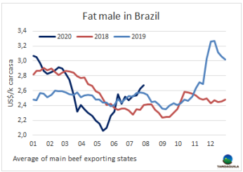待宰牛供應短缺繼續(xù)為有牛價施加壓力。本周圣保羅活牛價格上漲2雷亞爾/15公斤,不含稅的現(xiàn)金價格為220雷亞爾/15公斤。這一參考價格是國內市場的活牛參考價格。滿足中國市場條件的牛30月齡以下的公牛價格高5雷亞爾,小母牛213雷亞爾/15公斤,盡管預訂時間稍長,約8天,但價格堅挺已是事實。預計接下來幾天市場將更加堅挺,由于活牛短缺,出口需求旺盛,后面幾天接近月初也將支撐肉類市場價格。