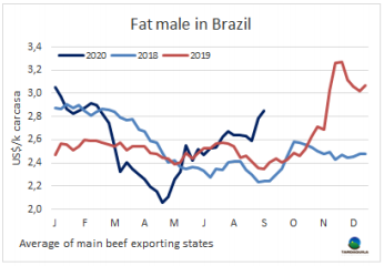 八月巴西牛肉對(duì)歐洲出口量繼2019年11月至今10個(gè)月以來首次達(dá)5000噸。這一貿(mào)易量是自五月低點(diǎn)以來連續(xù)第三個(gè)月增長(zhǎng)。今一月至八月對(duì)中國(guó)出口量下降了23%,下降至30307噸。