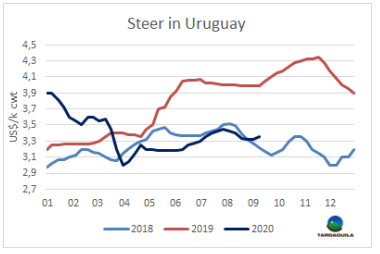 過去兩周,烏拉圭牛肉在美國(guó)市場(chǎng)的表現(xiàn)與預(yù)期脫軌。美國(guó)國(guó)內(nèi)牛肉產(chǎn)量旺盛,抑制了進(jìn)口業(yè)務(wù)的興趣,甚至連還價(jià)都沒有收到。此外,隨著氣溫的下降,美國(guó)餐飲的牛肉銷售開始放緩。