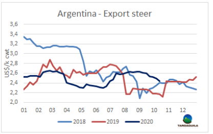 盡管阿根廷貨幣強勢貶值,但由于歐洲市場需求疲軟,價格下跌,出口閹牛價格下跌3比索/公斤。最好的英國純種閹牛目前成交在185-190比索/公斤。串種澤布牛參考價保持穩(wěn)定,185-188美元/噸。另一方面,中國市場是目前唯一有興趣的市場,中國需求增強,拉動活牛價格上漲。特優(yōu)母牛價格上漲了12-15比索,上漲至170-178比索。工業(yè)母牛價格上漲了14比索,目前報價在155-160比索。