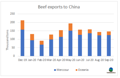 中國兩大牛肉供應商南美和澳洲9月向中國港口直接出口的牛肉估計為14.6萬噸,略高于8月的14.4萬噸,明顯低于5月份19.5萬噸的最高出口量。南美方面,巴西出口的下降部分被烏拉圭和阿根廷抵消。雖然目前還沒有得到阿根廷和烏拉圭的出口量數(shù)據(jù),但屠宰量的增長和國內(nèi)需求的疲軟應該會給上月的出口盈余留下更大的空間??傮w而言,南美地區(qū)出口量將在12.5萬噸左右,每月增加2000噸。另一方面,澳洲方面,新西蘭的出口增加至10480噸,澳大利亞的出口減少至10 387噸。運往中國的總出口量為20867噸,僅比8月份減少了108噸。