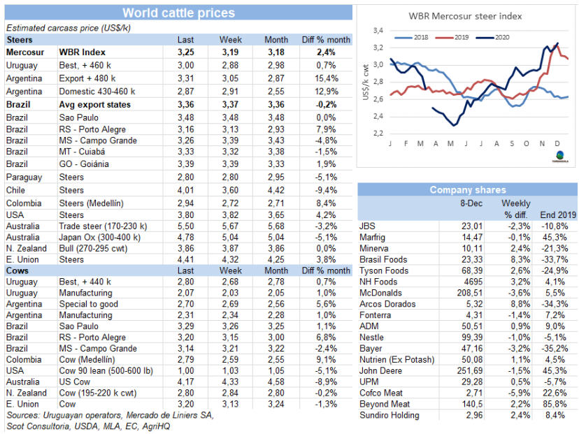 在經(jīng)歷了幾年來的價(jià)格低谷后,希爾頓臀腰肉價(jià)格上周有所恢復(fù)。阿根廷周一周二放假,上周希爾頓臀腰肉成交價(jià)8000美元/公斤,一些出口商已經(jīng)把價(jià)格提高到了8500美元/公斤。一位進(jìn)口商更加謹(jǐn)慎一些,提供一月中旬到港的貨價(jià)格在7700-8800美元/公斤。烏拉圭方面一些即時(shí)成交的貨成交價(jià)7000美元/公斤。歐洲有一小部分牛肉在流通,但人們對餐館消費(fèi)的復(fù)蘇仍存有疑慮。德國每天仍有超過1.5萬例感染病例,未來幾周不排除采取更嚴(yán)格的新控制措施的可能性。英國開始大規(guī)模接種疫苗可以在未來幾周內(nèi)改善了市場情緒。另一個(gè)對市場起到一定推動(dòng)作用的因素是巴西幾乎沒有報(bào)盤,因?yàn)檗k席工廠專注于國內(nèi)市場。