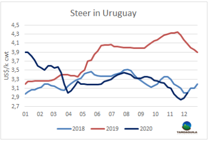受巴西雷亞爾升值、阿根廷和烏拉圭牛價(jià)顯著上漲拉動(dòng),本周閹牛價(jià)格指數(shù)上漲了6美分,上漲至3.25美元/公斤,達(dá)今年最高。巴西育成牛平均價(jià)格繼續(xù)下跌,但下跌趨勢被雷亞爾2%的升值完全抵消,主要出口州平均價(jià)格下跌了1美分,下跌至3.36美元/公斤。阿根廷牛價(jià)上漲緊隨巴西牛價(jià)值之后,本周含9%出口稅的出口閹牛價(jià)格上漲了26美分至3.31美元/分,烏拉圭牛價(jià)也有上漲,特種閹牛成交價(jià)恢復(fù)至3美元/公斤,較上周上漲了12美分。巴拉圭牛價(jià)在下跌了幾周之后保持穩(wěn)定。