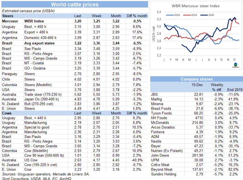 目前還沒有定論,但進口商有意對1-3月與南美國家簽訂的猶太屠宰合同重新議價。一位以色列進口商稱,“我們確信,我們將無法繼續(xù)按目前的價格對巴西和巴拉圭支付貨款。”第一次正式談判可能會在下周舉行,屆時將看到新的進展。一家巴拉圭工廠稱,目前重新談判的牛前部位肉參考價6000美元/噸的合同是“可行的”。他解釋說,調(diào)整的空間將主要取決于牛價是否維持上周的下行通道,育成牛價格低于3美元/公斤(每公斤2.70美元)0.30美元。