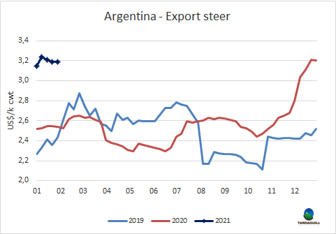 今年肉牛銷售額下降3.23億美元至18.63億美元,為過去四年的最低水平,下降了14.8%。以恒定比索計算,由于美元自去年3月以來的復(fù)蘇,降幅稍小一些,為7.2%。美元銷售額下降是由于活牛出口增加,待宰牛銷售量下降。待宰牛數(shù)量減少了22.5萬頭,至200萬頭。但肉類產(chǎn)量的降幅較小,只有7.5%,這是由于平均屠宰重量增加,因為閹牛屠宰量占比增加,且各類別的牛平均重量均有增加。2020年平均胴體重259.5 kg,年均增長7.2 kg(+2.9%)。平均價格下降了6.7%至872美元/頭。銷售量減少和平均價格下降使屠宰牛的銷售額減少3.36億美元(-16.1%)至17.5億美元?;钆3隹诜矫?,雖然貿(mào)易數(shù)量減少,但平均出口價格的增加(賣給中國用于繁殖目的的小母牛的比例很高)使出口額增加了大約1300萬美元,達(dá)1.13億美元。由于美元增值,按烏拉圭比索計價(生產(chǎn)商支付運費、人工費等),銷售額降幅較小。2020年平均1美元兌42比索,2019年1美元兌35.3比索,今年的通脹率達(dá)9.4%,因此按恒定比索計算,肉牛成交額下降了7.2%。