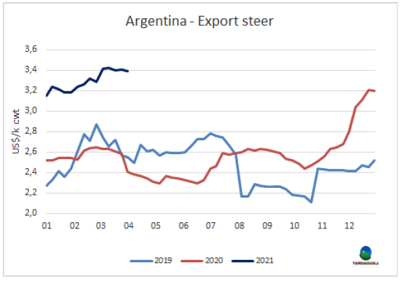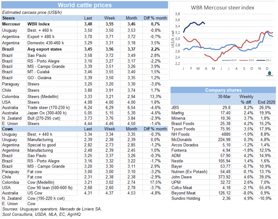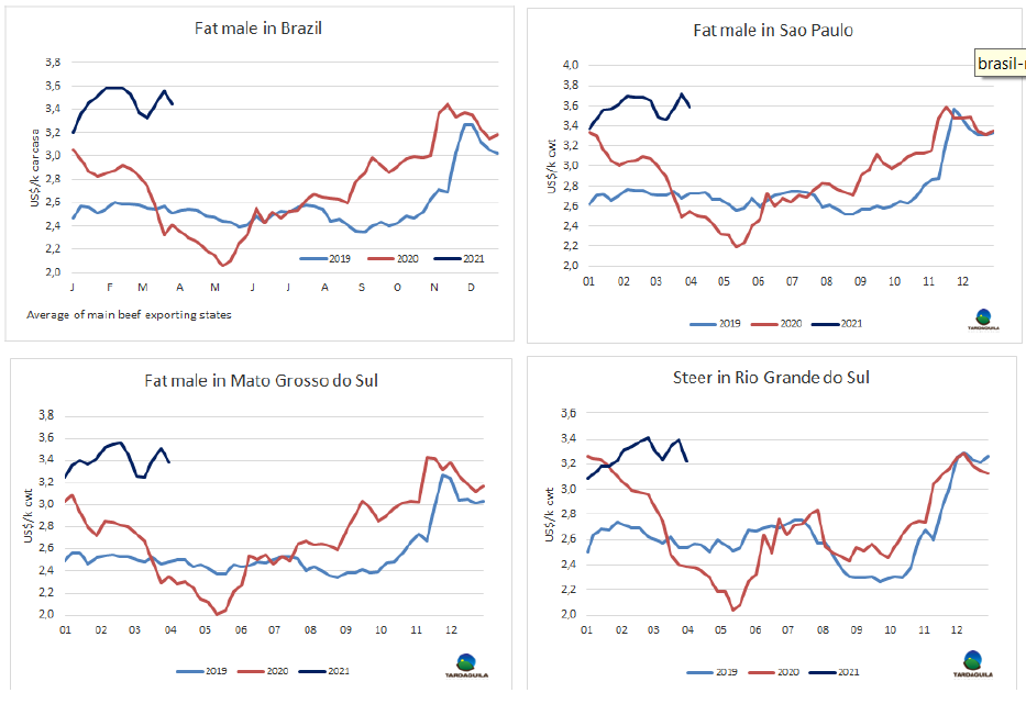 對(duì)于疫情發(fā)展的擔(dān)憂和巴西內(nèi)閣部長(zhǎng)的換屆給巴西貨幣價(jià)值造成影響。巴西雷亞爾較美元貶值了4.4%。因此盡管巴西按雷亞爾計(jì)的育肥牛價(jià)格繼續(xù)上漲,轉(zhuǎn)換成美元價(jià)格后本周下跌了11美分至3.45美元/公斤。本周其他地區(qū)牛價(jià)保持不變。南方共同市場(chǎng)牛價(jià)下降了7美分至3.48美元/公斤。