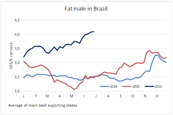 本周育肥牛市場保持堅挺,價格變化不大。隨著活牛運輸旺季到來,供應(yīng)仍然吃緊。然而需求端試圖減少采購來對抗這一情況,使價格不再繼續(xù)攀升。圣保羅州的平均價格與上周保持同一水平,銷售到國內(nèi)市場的育肥牛價格在310雷亞爾/15公斤,用于出口的育肥牛價格要高7雷亞爾。戈尼亞、米內(nèi)羅三角洲等地牛價有上漲,其他地區(qū)如大坎波、庫亞巴、隆多尼亞牛價有輕微上漲。批發(fā)市場周末的牛肉銷售不佳,但預(yù)計接下來幾天,受月初效應(yīng)影響牛肉銷售將有好轉(zhuǎn)。本周期貨市場育肥牛價格下跌,尤其是九月合同直至年末。這是由于巴西雷亞爾升值以及Guedes部長關(guān)于巴西貨幣有更多升值空間的預(yù)期,給出口商造成壓力,導(dǎo)致的出口平衡惡化。