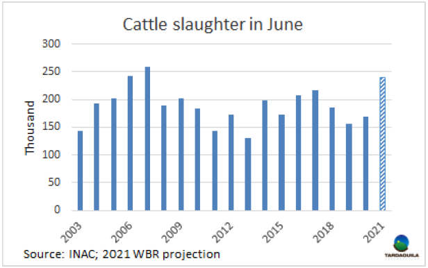 上周牛屠宰量再次增長,據(jù)烏拉圭肉協(xié)報告統(tǒng)計,截止6月26日的一周,屠宰量56395頭,較上周增長了8000頭,較去年同期增長了18000頭。這是今年屠宰量第三大的一周。盡管481配額的屠宰結(jié)束,燕麥飼養(yǎng)的牛出欄延期,但采購需求堅挺帶動屠宰量增長,所有種類的牛,無論好壞,都被買走了。本周屠宰量增長最大的是閹牛,本周增加了4301頭至25530頭(+20.3%),母牛屠宰量增加了3181頭至23214頭,小母牛屠宰量增加了457頭,至6250頭。屠宰量最大的工廠是Tacuarembo(4718頭),Ontilcor(4469頭),Las Piedras(4385頭)。Marfrig四家工廠屠宰總量14380頭, Athena三家工廠屠宰總量12164頭。據(jù)本月結(jié)束僅剩3個工作日,六月屠宰量已達208093頭,本月屠宰量將超過24萬頭,較2020年六月約增長7萬頭,是6月屠宰量第三大的年份,僅次于2006年和2007年。今年前半年牛屠宰量將達124萬頭,較去年增長了29.1萬頭,增長了31%。
