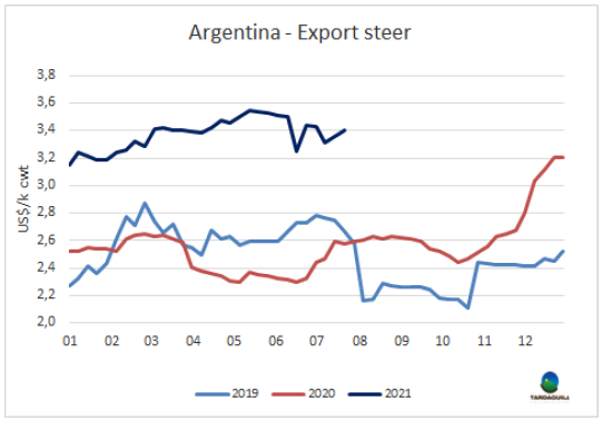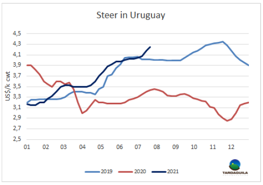 6月閹牛類型價值1261美元/頭,較上月增長了65美元,達2020年1月至今17個月以來的最高。烏拉圭肉協(xié)報告稱本月閹牛類型價值增加的原因是出口部位肉價格上漲和國內(nèi)市場胴體價格、副產(chǎn)品和鮮皮價格上漲?;钆2少弮r格上漲了37美元/頭,因此兩者的價差工業(yè)增加值增長了29美元至214美元,工業(yè)增加值增長了1.5%至17%,如果價值低于20%,則認(rèn)為該行業(yè)很難實現(xiàn)正利潤。