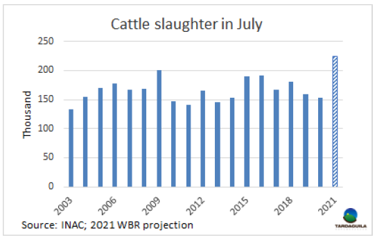 7月前17天,烏拉圭屠宰行業(yè)牛屠宰量達127297頭,較2020年同期增長了4萬頭(46%),據(jù)本月結(jié)束還剩兩周,預(yù)計2021年七月牛屠宰量將達歷年七月最高。截至目前只有兩各年度期月屠宰量超過20萬頭,1982年(歷史上最糟糕的一次經(jīng)濟危機,以所謂的“匯率制度”的崩潰而告終)和1989年,當(dāng)時烏拉圭經(jīng)歷了嚴(yán)重的干旱,這兩年的屠宰量分別達到了20.1萬頭和20.3萬頭。今年如果接下來兩周的周屠宰量保持5萬頭以上,七月屠宰量將達22.5萬頭,將輕松超過以往的屠宰量記錄。記者問詢的工廠都一致認(rèn)為接下來兩周屠宰量將保持當(dāng)前節(jié)奏,一些工廠已經(jīng)備足了待宰牛,因此大概率七月屠宰量記錄將會打破。上周,盡管冬季來臨,據(jù)烏拉圭肉協(xié)報告統(tǒng)計,上周牛屠宰量51754頭,較前一周增長了550頭,屠宰量連續(xù)第四周保持五萬頭以上,較去年同期增長了2萬頭以上,(+66%)。本周閹牛屠宰量繼續(xù)減少,母牛屠宰量增長。閹牛屠宰量較上周減少了9%至21398頭,母牛屠宰量增長了9%至22868頭,母牛屠宰量較去年同期有突出的增長。屠宰量最大的工廠是Las Piedras(4475頭),Athena-pulsa(4384頭),Carrasco(4079頭)。Marfrig四家工廠屠宰總量14019頭,較上周下降了700頭, 從這周起,Colonia廠所有員工開始休假,因此接下來四周Marfrig僅有三家工廠進行屠宰活動。Athena工廠屠宰下降了約400頭至12402頭。