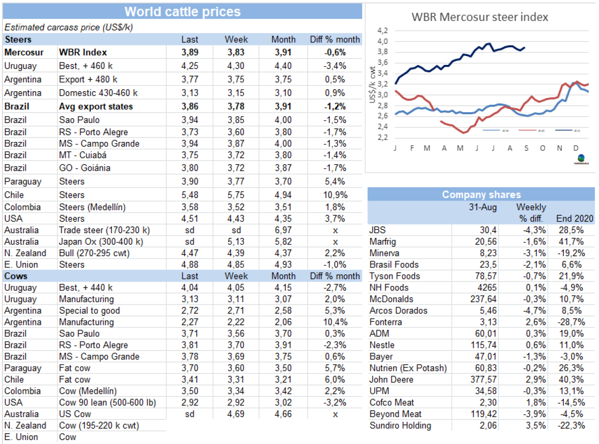 烏拉圭的屠宰活動保持緊張節(jié)奏,屠宰后的牛肉很難在冷庫安放的問題仍然存在,由于8月25日的非工作假期,工作日減少了一個工作日,但屠宰量仍達49807頭牛,比前一周減少7724頭(-13%),較去年同期增加了51%。8月屠宰數(shù)據僅剩兩天沒有統(tǒng)計,目前已達204841頭。八月牛屠宰量從未超過20萬頭,因此今年八月的牛屠宰量將達22.5萬頭-23萬頭,創(chuàng)新紀錄。今年前8個月,屠宰量累計170萬頭,比2020年同期增加約45萬頭(+36%),比2019年同期增加16萬頭(+10%)。上周閹牛屠宰量25808,母牛屠宰量15139頭,分別較上周下降18%和16%。相比之下,小母牛屠宰量增加了14%,達8330頭。工廠將繼續(xù)為從10月1日開始的481配額滿負荷運作,并將持續(xù)到下周。本周屠宰量前三的工廠是Las piedras(4017頭)和美麗華集團的兩家,Canelones(3918頭)和Pulsa(3757頭)本周Minerva集團屠宰量達11259頭, Marfrig緊隨其后,屠宰量達11111頭,本周美麗華屠宰量減少了1659頭,Marfrig屠宰量減少了3029頭。