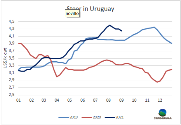 自8月初價格達歷史最高水平以來,育肥牛市場一直保持著溫和的下跌趨勢。一方面,有些人認為供應略有增多,另一方面,需求端非常關心是否可以找到集裝箱把已完成的產量運走。有工廠稱未來幾天甚至幾周由于裝運延誤可能將被迫減產。美麗華決定可能從下周中旬開始停止在3廠的生產,并讓員工休假直到10月初。Marfrig還在評估暫停55廠的屠宰活動,可能在未來幾小時內做出決定。目前的裝運除了通過蒙得維的亞港以外,也在尋求其他港口,但這并不容易,南美地區(qū)乃至世界上所有港口都有同樣的問題。有些工廠預定了3-4周后的牛,但還沒有采購;還有一些工廠預定一周之內交貨的牛,母牛的需求量大于閹牛。特種閹牛價格大多是每公斤4.25美元,有幾頭超過了4.20美元,偶爾也有4.3美元的交易。對于母牛來說,體重較重的一般支付4.00-4.05美元,體重較低的最高可達4.10美元。人們預計,市場將繼續(xù)緩慢下滑,特別是在物流問題無法解決的情況下。育肥牛市場保持下行趨勢,或將持續(xù)數(shù)周。據被問詢的市場參與者反映,大多數(shù)工廠備貨充足,期貨采購時間拉長,有些工廠甚至開始買九月前10天的牛。這種情況下工廠壓價幾美分,只要生產者可以接受,價格會繼續(xù)下跌。本周用于出口的特種閹牛參考價4.3美元/公斤,國內市場的閹牛參考價4.25美元/公斤,肉母牛4.05-4.15美元/公斤,牛供應量仍很少,預計15天之后隨著天氣變化和烏拉圭南部的降雨來臨活牛供應將增加。