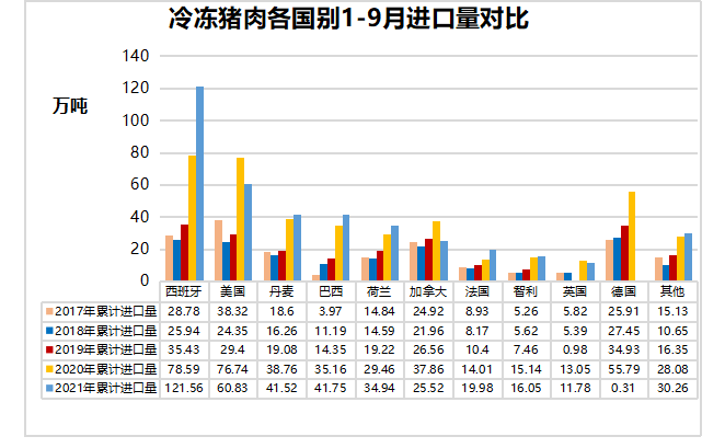 9月,中國主港豬肉進口量30.86萬噸,環(huán)比減少19%,同比減少34%。1-9月,中國主港豬肉進口量404.50萬噸,同比減少4%。進口國別方面,西班牙仍是中國豬肉進口第一大國,累計出口中國121.56萬噸,占中國豬肉進口總量的30%。其次是美國、巴西、丹麥、荷蘭、加拿大、法國、智利、英國、愛爾蘭、墨西哥和奧地利。值得關(guān)注的是,巴西豬肉累計出口中國41.75萬噸,超過丹麥,成為中國豬肉進口第三大國。