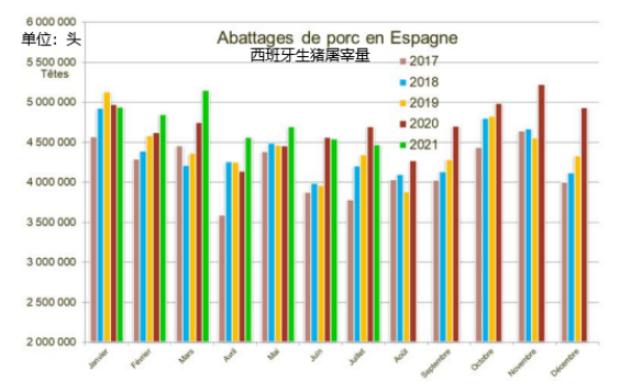 2021年第一季度,歐盟生豬存欄1.30億頭,同比減少0.6%。其中,西班牙生豬存欄3240.7萬頭,同比增加3.3%。德國生豬存欄2463.9萬頭,同比減少3.3%。法國生豬存欄1298.7萬頭,同比減少1.7%。丹麥生豬存欄1317萬頭,同比增加0.1%。荷蘭生豬存欄1147.2萬頭,同比減少3.3%。除了西班牙和丹麥能繁母豬數(shù)量同比分別有4.2%和2%的增長,德國、法國、荷蘭能繁母豬存欄均有減少。屠宰量方面,德國1-7月生豬屠宰量3029.2萬頭,同比減少2.6%。西班牙1-7月生豬屠宰量3321.1萬頭,同比+2.71%。其中,7月屠宰446.9萬頭,同比減少4.76%。