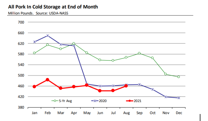 存欄方面,USDA9月1日生豬存欄數(shù)據(jù)顯示,生豬存欄7540萬頭,環(huán)比增加1%,同比減少4%。能繁母豬存欄619萬頭,同比減少2%,較6月統(tǒng)計的存欄減少0.6%。這是自2013年以來首次9月統(tǒng)計的能繁母豬存欄量低于6月統(tǒng)計的能繁母豬存欄量。預(yù)計明年春天和夏天會迎來能繁母豬存欄歷史低位。商品豬存欄6920萬頭,同比減少4%。生豬存欄量同比減少比較明顯的是體重低于120磅的,這些生豬預(yù)計在今年冬季出欄,相應(yīng)的屠宰量預(yù)計同比減少6%。