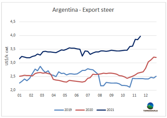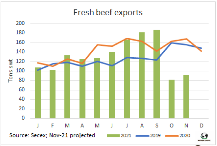 上周希爾頓臀肉出口價(jià)格急劇下跌,一系列因素給市場(chǎng)帶來(lái)不確定性。首先是歐洲市場(chǎng)對(duì)第四波疫情采取了新的管控,德國(guó)和荷蘭宣布了新的防疫限制措施,奧地利則選擇控制未接種疫苗的人口(超過(guò)30%),以遏制疫情的傳播。上周歐元走軟,人們猜測(cè)明年1月1日開(kāi)放的下一個(gè)季度配額窗口會(huì)有大量481配額的牛肉進(jìn)入。盡管阿根廷方面的報(bào)盤(pán)有限,成交價(jià)達(dá)13300-13800美元/噸離岸價(jià)。最近幾天由于工會(huì)罷工屠宰活動(dòng)減少了很多。