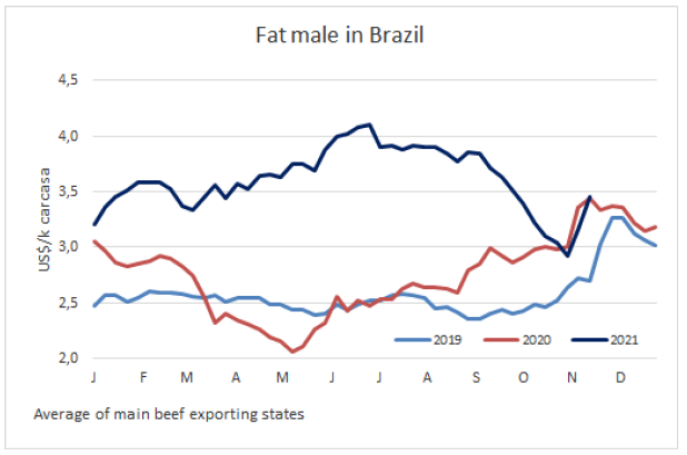 本周隨著巴西國(guó)內(nèi)市場(chǎng)需求對(duì)巴西育肥牛價(jià)格產(chǎn)生的積極作用,以及阿根廷和巴拉圭牛價(jià)上漲,南方共同市場(chǎng)閹牛價(jià)格指數(shù)反彈,較上周上漲19美分至3.72美元/公斤,達(dá)九月末以來(lái)最高。由于巴西國(guó)內(nèi)需求的改善和育肥牛供應(yīng)的減少,巴西主要出口州育肥牛價(jià)格在一周內(nèi)上漲了29美分,達(dá)3.45美元/公斤。南美地區(qū)牛價(jià)還受到阿根廷和巴拉圭的拉動(dòng),阿根廷的供不應(yīng)求導(dǎo)致活牛參考價(jià)上漲14美分至4.33美元/公斤,使阿根廷的牛價(jià)上漲至南美地區(qū)最高。巴拉圭方面對(duì)以色列的出口需求和降雨的到來(lái)使牛價(jià)從上周的下行開(kāi)始有所回升,唯一一個(gè)牛價(jià)下行的國(guó)家是烏拉圭,上周由于工會(huì)罷工,草飼牛需求有所緩解,參考價(jià)約達(dá)4.08美元/公斤。