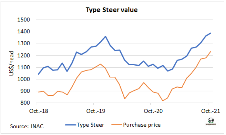 閹牛類型價(jià)值,是對(duì)牛肉工廠出售牛分割出的所有產(chǎn)品價(jià)格的加權(quán)估算,10月閹牛類型價(jià)值達(dá)歷史新高。據(jù)INAC的報(bào)告,閹牛類型價(jià)值平均1389美元,比9月增加了22美元,比去年同期增加了261美元(23%)。INAC稱這是因?yàn)椤俺隹诓课蝗夂蛧?guó)內(nèi)市場(chǎng)胴體價(jià)格的上漲”。相反,鮮皮、內(nèi)臟和副產(chǎn)品價(jià)值下降。相反,10月活牛采購(gòu)價(jià)上漲了53美元/頭至1233美元/頭。活牛采購(gòu)價(jià)與閹牛類型價(jià)值之間的差額(INAC稱之為工業(yè)增加值)本月減少了31美元至156美元,僅為閹牛類型價(jià)值的11.2%。