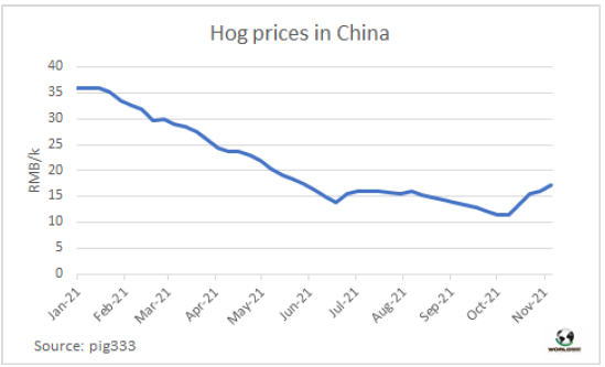 近五周內(nèi),中國(guó)毛豬價(jià)格已經(jīng)上漲近50%,從十月初的11.54元/公斤上漲至17.1元/公斤。盡管仍較年初水平低50%,這已經(jīng)是2021年截至目前第一個(gè)較大的反彈。