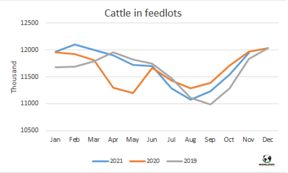 美國(guó)農(nóng)業(yè)部11月1日發(fā)布的育肥牛存欄預(yù)估約1190萬(wàn)頭,較去年同期略有下降。10月補(bǔ)欄量225萬(wàn)頭,較2020年10月增加了2%。育肥牛出欄量179萬(wàn)頭,較去年下降了5%。